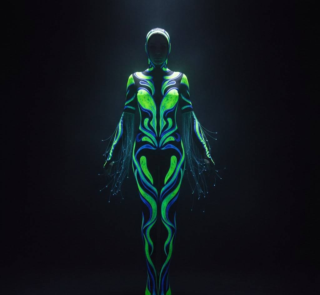 Inspired by deep-sea creatures and alien flora, this look incorporates glow-in-the-dark elements and UV-reactive materials. Perfect for creating an otherworldly presence that literally lights up the room.