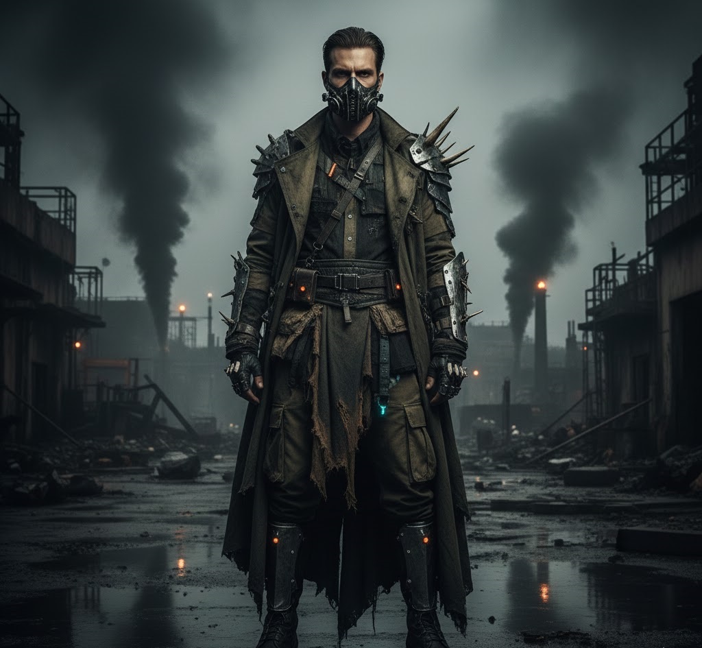 Mix distressed elements with high-tech details for a survivalist-meets-scientist vibe. Layered technical fabrics, utility belts with LED accents, and weathered metallics create a look that tells a story of resilience in a transformed world.