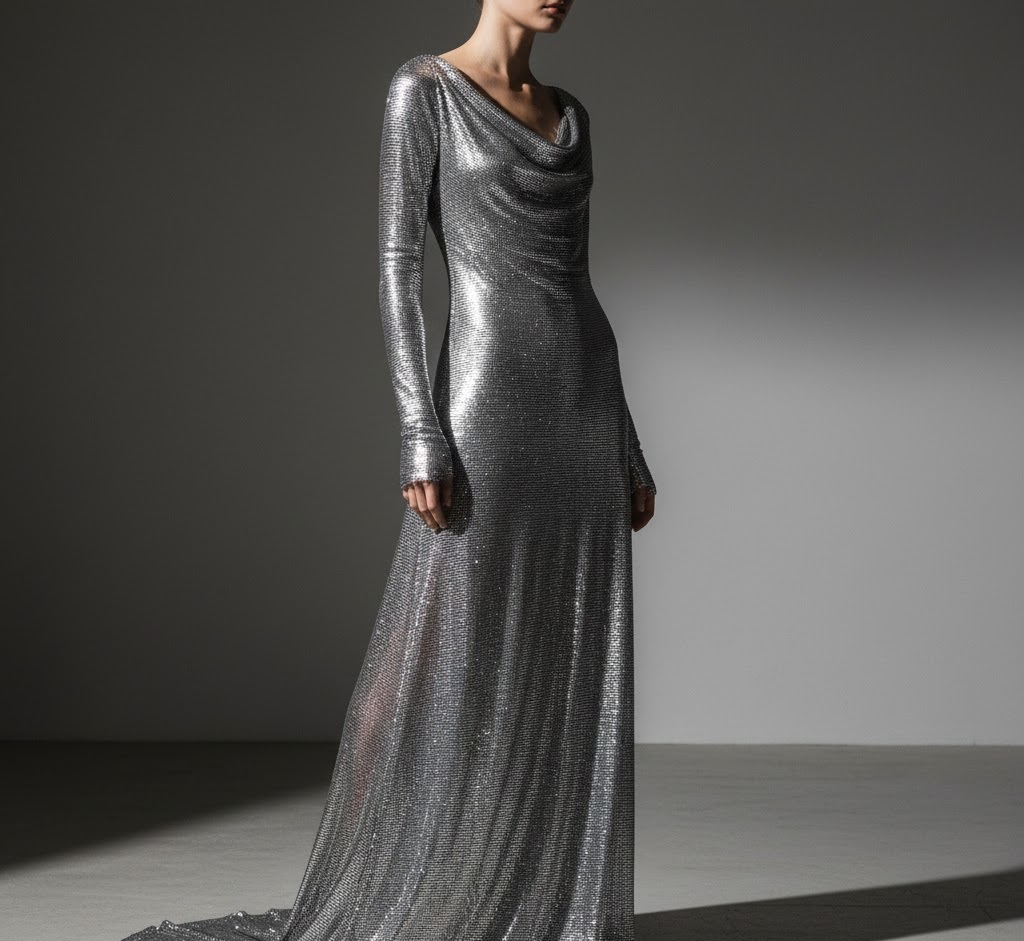 Nothing says “future” quite like head-to-toe chrome. This look features reflective metallic fabrics that catch light from every angle, creating an almost liquid metal effect. Pair a chrome bodysuit with matching boots and geometric accessories for a look that’s both minimalist and maximum impact.