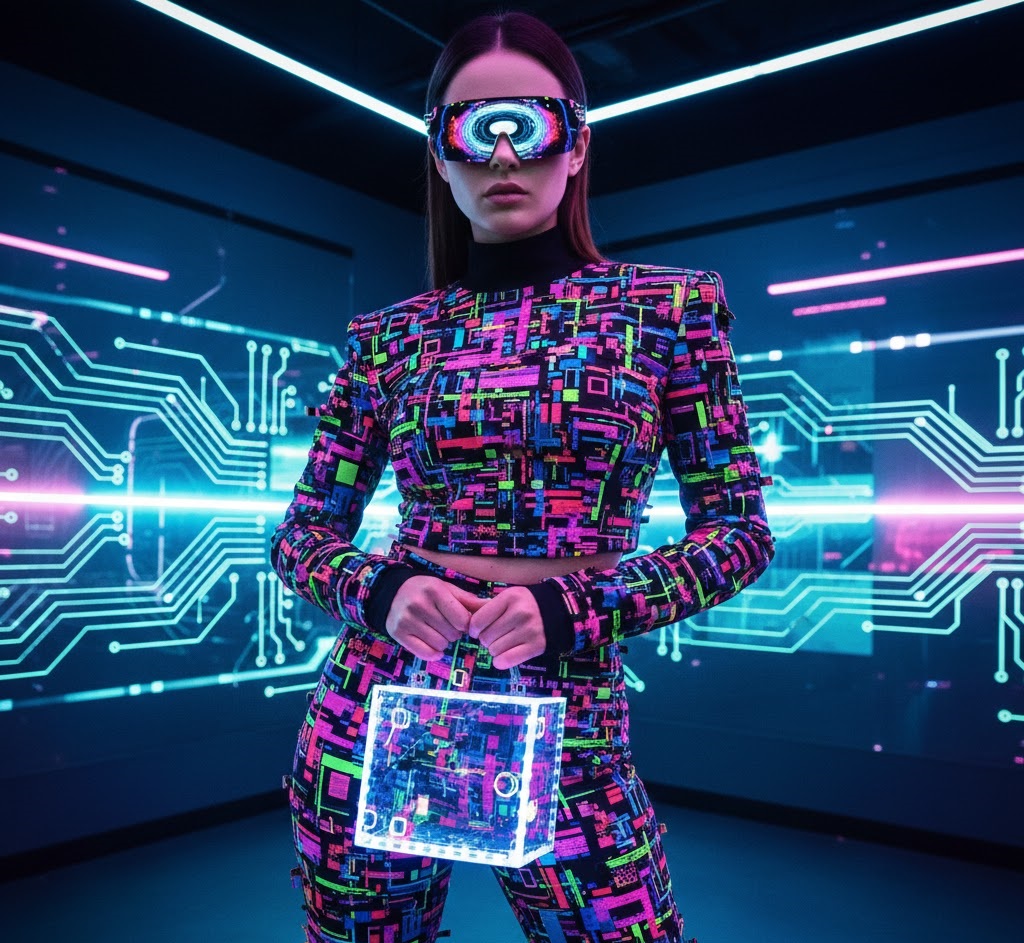 Take inspiration from VR and gaming culture with pixelated patterns, digital glitch effects, and references to user interfaces. This meta look bridges the gap between physical and digital fashion.
