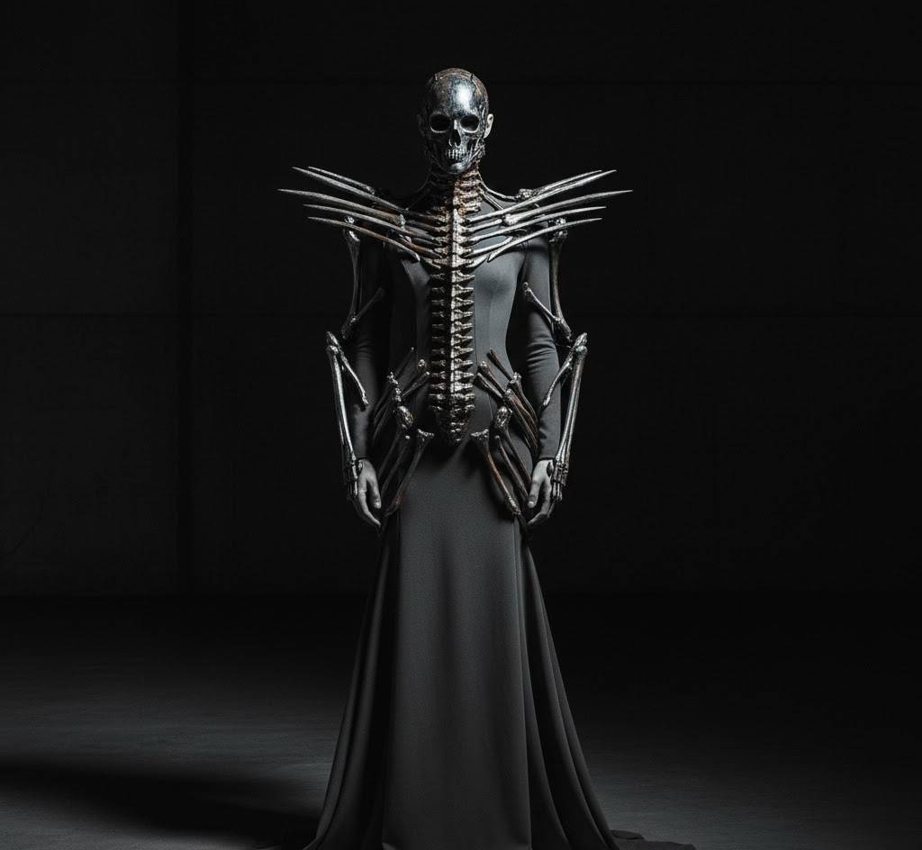 Inspired by the works of H.R. Giger, this look blends organic and mechanical elements. Think structured pieces with spine-like details, exoskeleton-inspired accessories, and fabrics that mimic both skin and metal. It’s hauntingly beautiful and undeniably bold.