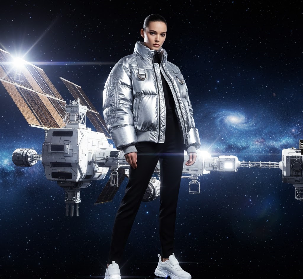 Combine space exploration aesthetics with high fashion luxury. Think puffy metallic bomber jackets reminiscent of space suits, paired with sleek trousers and designer sneakers. It’s astronaut meets haute couture.