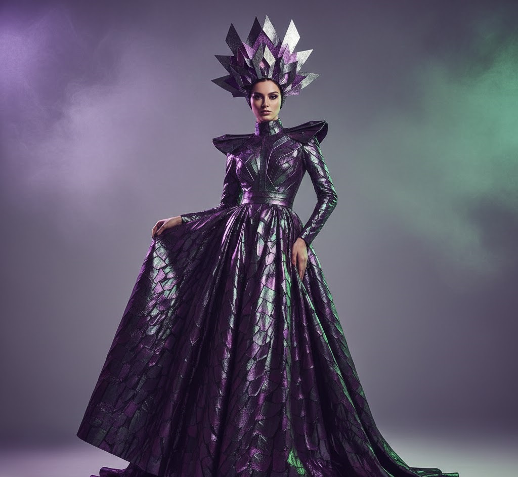 Embrace extraterrestrial elegance with flowing fabrics in unexpected textures and colors. Iridescent purples, metallic greens, and fabrics that seem to defy gravity create a look fit for intergalactic royalty. Crown it with an avant-garde headpiece for maximum drama.