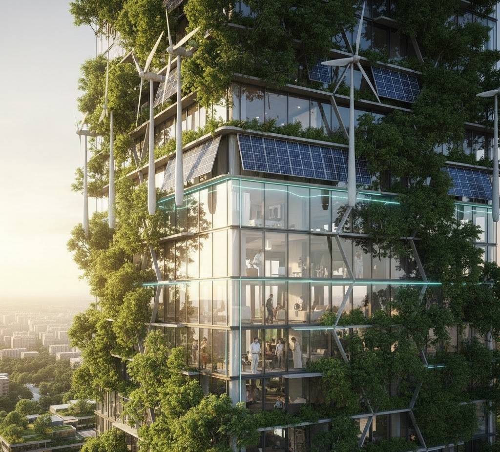 Wind integration: Vertical axis turbines built into skyscrapers capture urban wind currents without the massive footprints of traditional turbines.