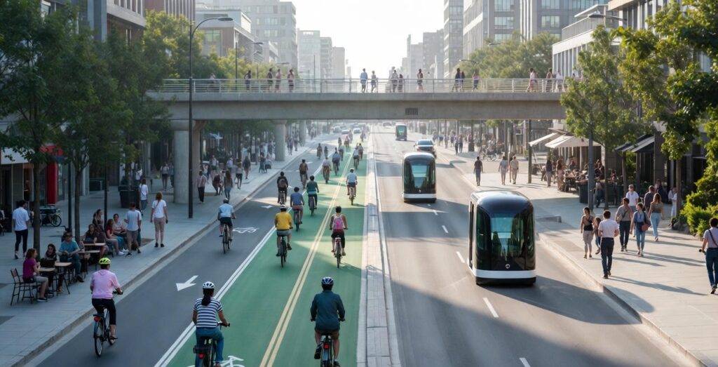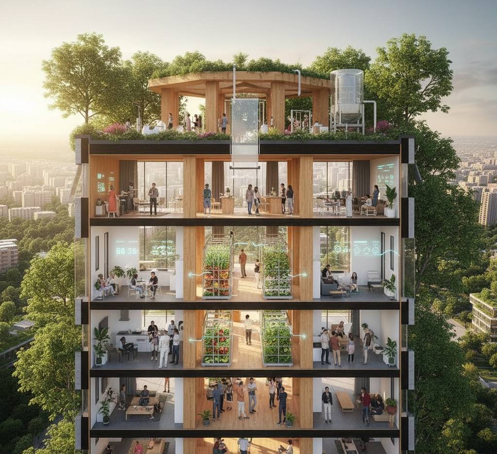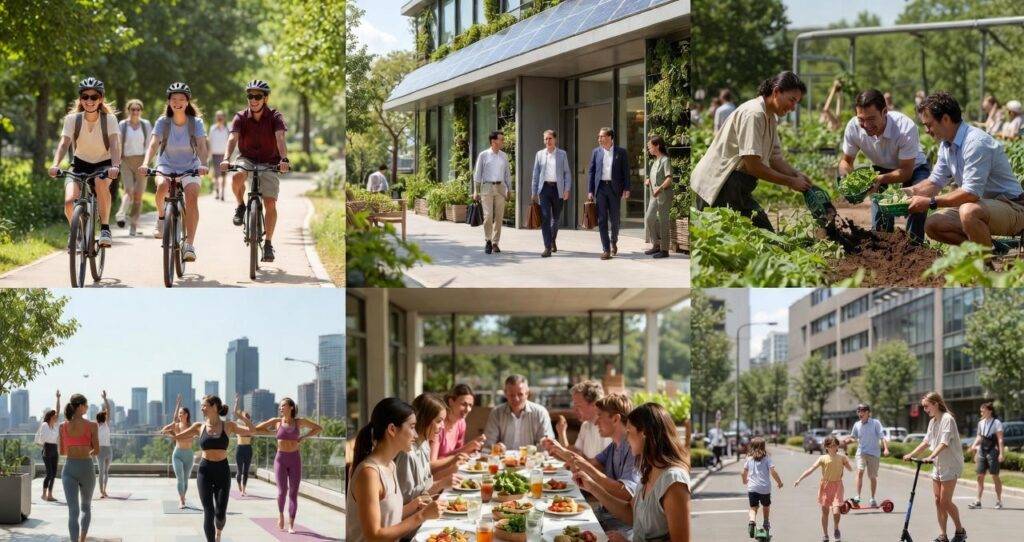 Morning: Wake naturally (optimized circadian lighting), breakfast from rooftop garden produce, walk or bike to work through tree-lined paths (10-minute commute).