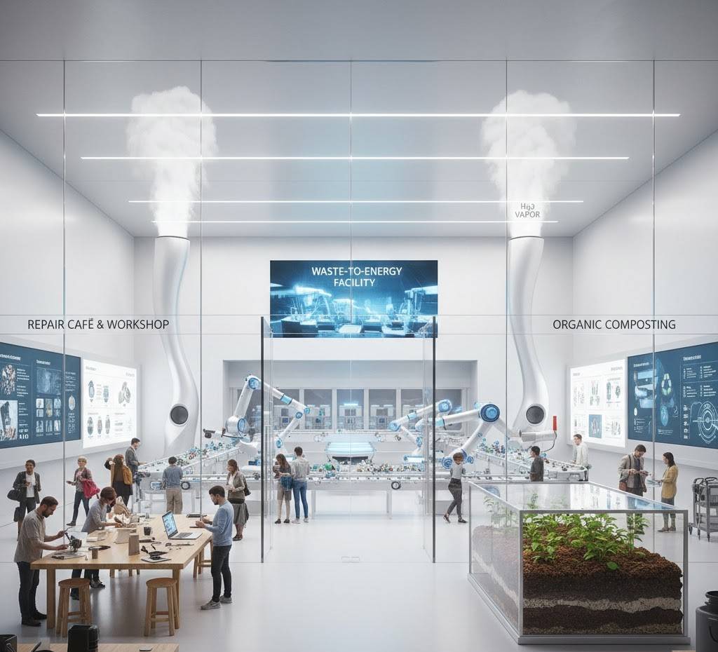 Organic waste: Composted locally, feeding urban farms and green spaces.