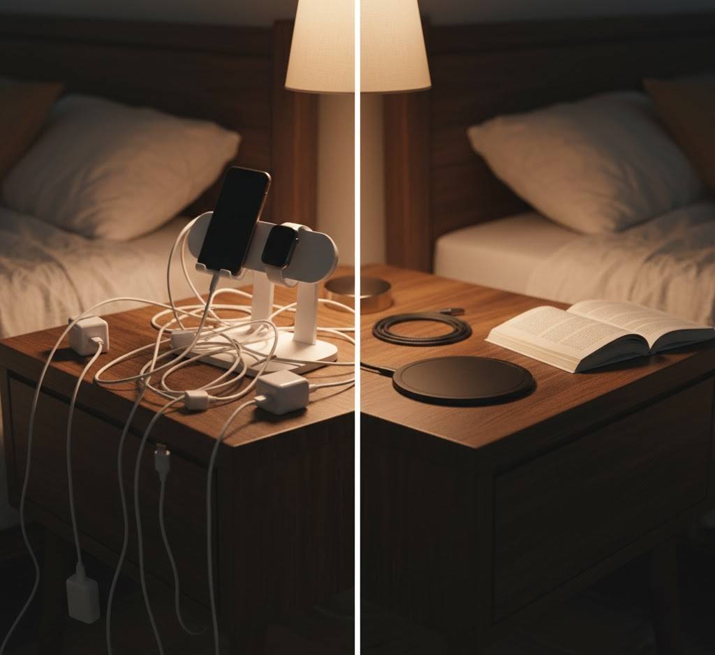 A sinistra il mio vecchio comodino del 2023: 4 cavi, 3 caricatori, groviglio. A destra oggi: solo il disco nero e basta. La differenza è quasi commovente.