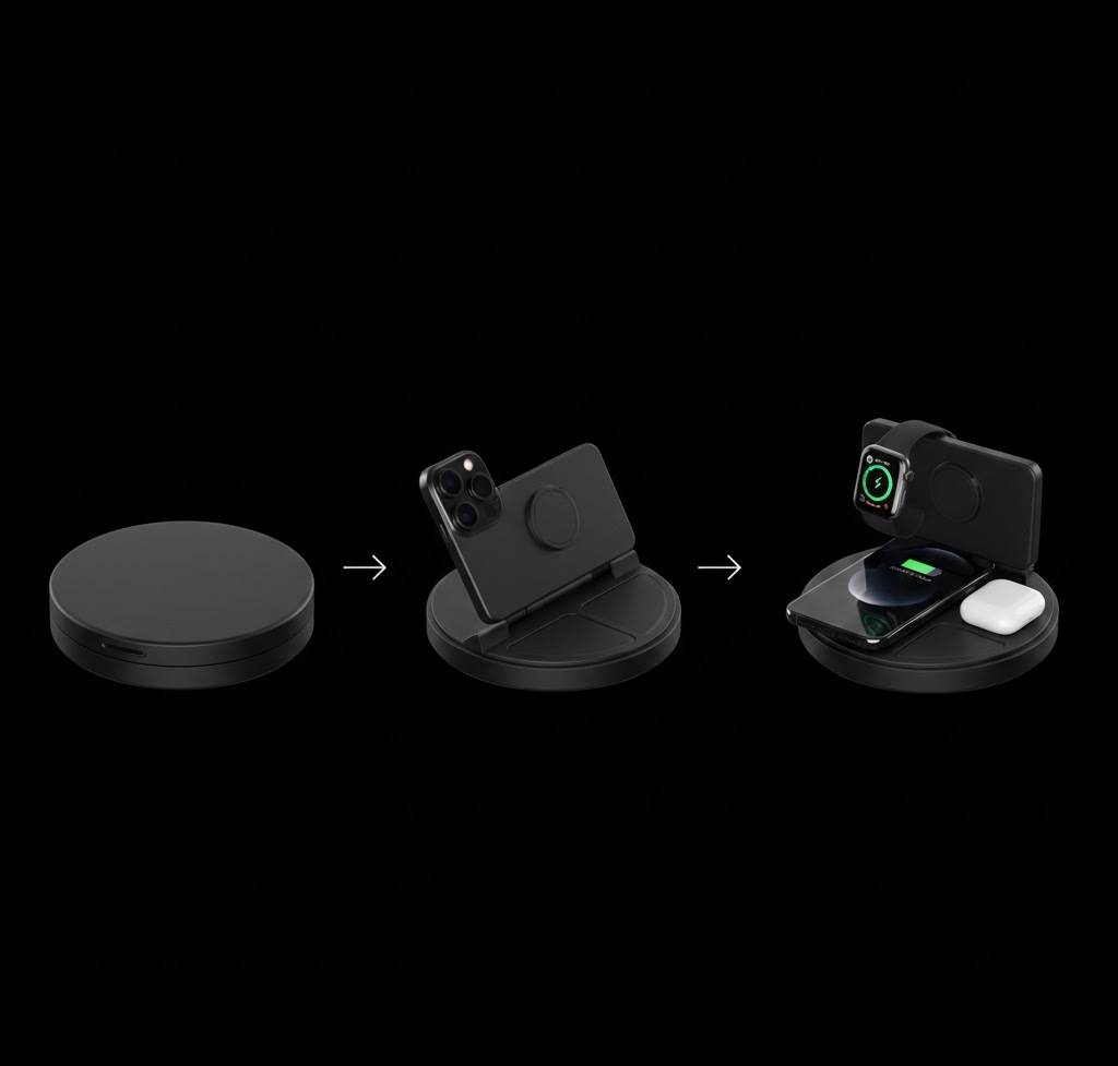 Carica contemporaneamente iPhone (15 W), Apple Watch (5 W) e AirPods (5 W). Eppure non ha tre “piattini” separati: c’è un piccolo supporto magnetico pieghevole per l’orologio che scompare dentro il corpo quando non lo usi, e la zona AirPods è nascosta sotto una superficie morbida in alcantara nera. Quando è chiuso è solo un disco.