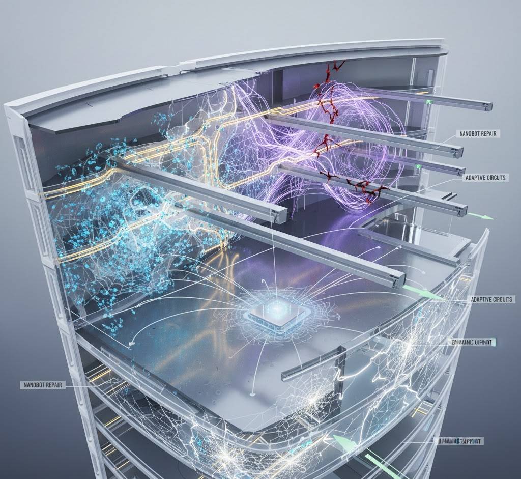 Cracks in concrete? Microscopic repair robots embedded in the material detect damage and seal it within hours—not with patches, but by rearranging molecules to restore original strength.