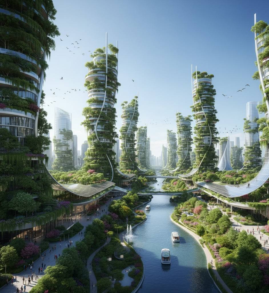 Cities have become carbon sinks rather than sources. Green architecture isn’t a luxury—it’s standard. Rooftop forests, vertical gardens, and bio-concrete that absorbs CO2 mean urban areas actually clean the air.