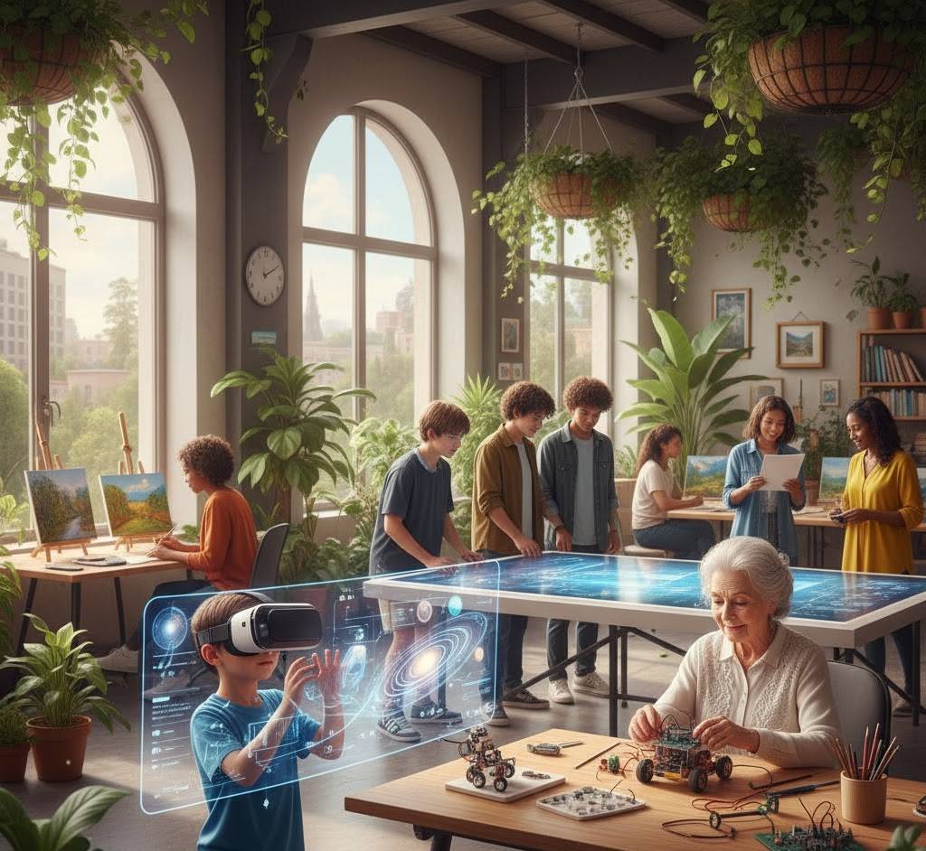Age segregation ended. Eight-year-olds learning advanced mathematics study alongside adults changing careers. Retirement-age folks master new skills beside teenagers. Learning communities span generations.