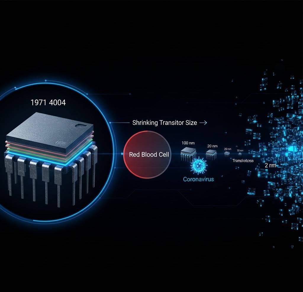 In 1971 a transistor was 10,000 nm wide. Today the most advanced nodes (TSMC 2 nm, 2025–2026) are 2 nm — 5,000 times smaller. If a 1971 transistor was the size of a house, today’s is smaller than a virus.
