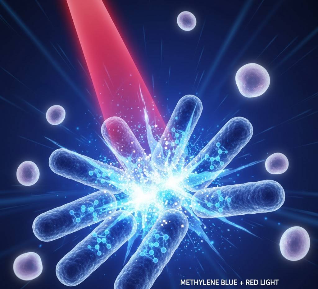 Photodynamic therapy combines methylene blue with light. The dye accumulates in bacteria, viruses, or fungi. Expose them to red light, and methylene blue generates reactive oxygen species that destroy the pathogens without harming human cells.