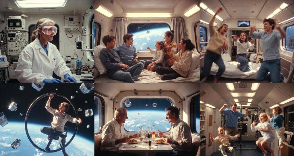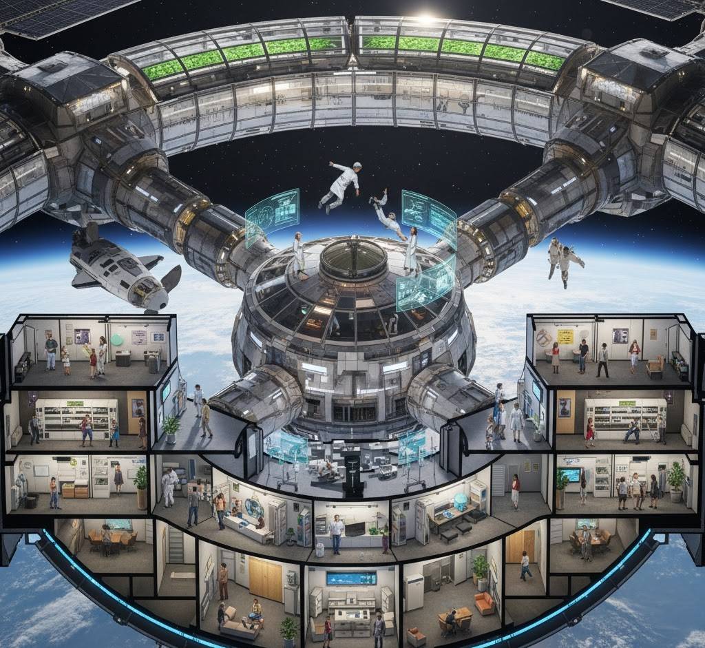 Morning: Wake in personal quarters with Earth-view window. Shower in water that actually falls (gravity ring). Breakfast from station-grown produce.