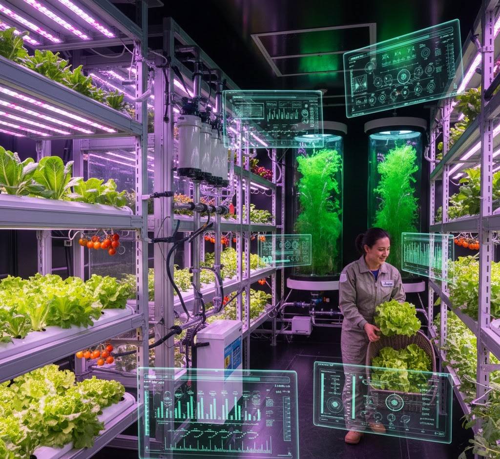 Algae bioreactors: Producing oxygen through photosynthesis while absorbing CO2 and providing edible biomass.