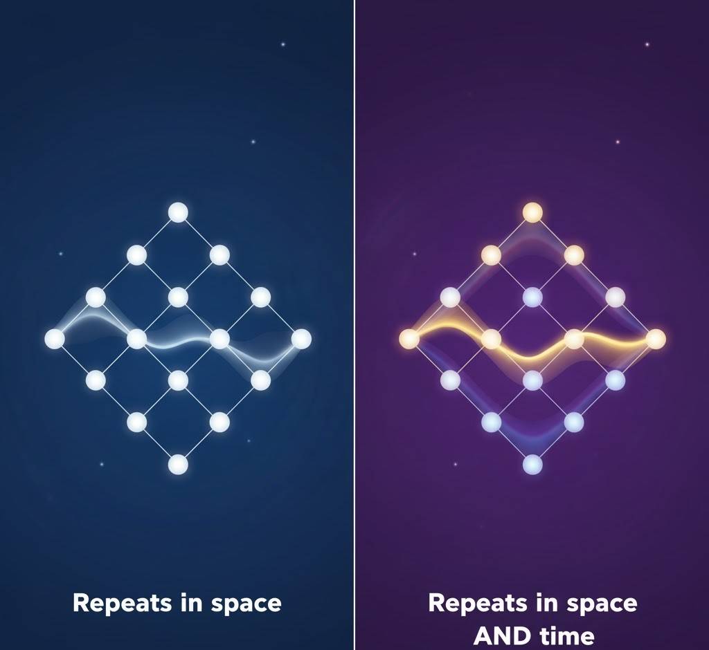 We all know regular crystals: salt, diamonds, snowflakes. They have atoms arranged in repeating patterns in space — up-down, left-right, forward-back. That perfect order is what makes them sparkle and gives them special properties.