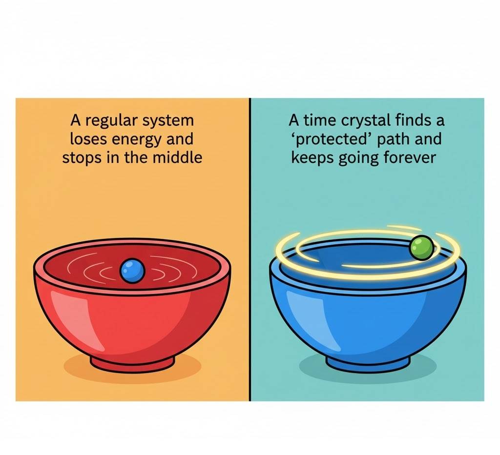 A time crystal takes this idea one step further. Its atoms repeat a pattern not just in space, but also in time. They oscillate — move back and forth — in a perfect rhythm forever, without ever needing a push or energy to keep going. It’s like a jelly that wobbles on its own, forever, in your fridge with the door closed.